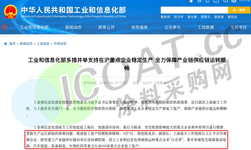 在保障供應(yīng)鏈方面,工信部也帶來(lái)了好消息。4月15日,工業(yè)和信息化部網(wǎng)站發(fā)布文章稱,工信部近日派出上海前方工作組,與上海市有關(guān)部門一道,全力做好醫(yī)療物資供應(yīng)保障,推動(dòng)重點(diǎn)工業(yè)企業(yè)穩(wěn)定生產(chǎn)和復(fù)工復(fù)產(chǎn),保障產(chǎn)業(yè)鏈供應(yīng)鏈運(yùn)轉(zhuǎn)順暢。
