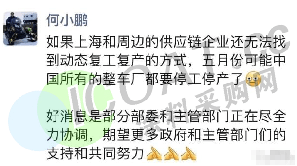 4月14日,小鵬汽車董事長(zhǎng)何小鵬通過(guò)朋友圈發(fā)文稱,如果上海和周邊的供應(yīng)鏈企業(yè)還無(wú)法找到動(dòng)態(tài)復(fù)工復(fù)產(chǎn)的方式,5月份可能中國(guó)所有的整車廠都要停工停產(chǎn)了。