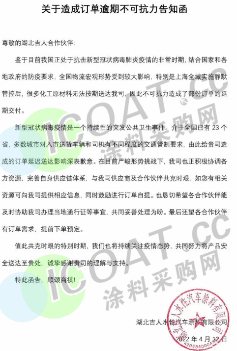 湖北吉人水性汽車涂料:很多化工原材料無法按期送達,因此不可抗力造成了部分訂單的延期交付,由此給貴司造成的訂單延遲送達影響表示歉意。