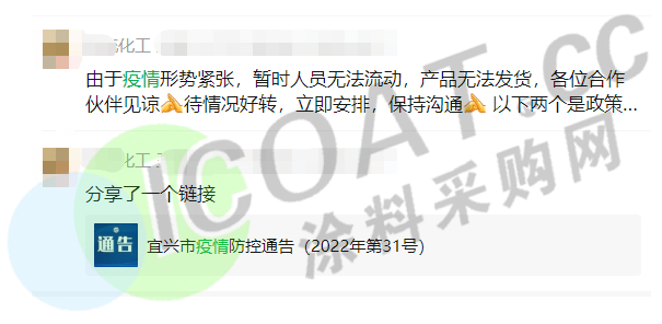 江蘇宜興某化工企業表示,疫情形勢緊張,人員無法流動,產品無法發貨,請各位合作伙伴見諒。