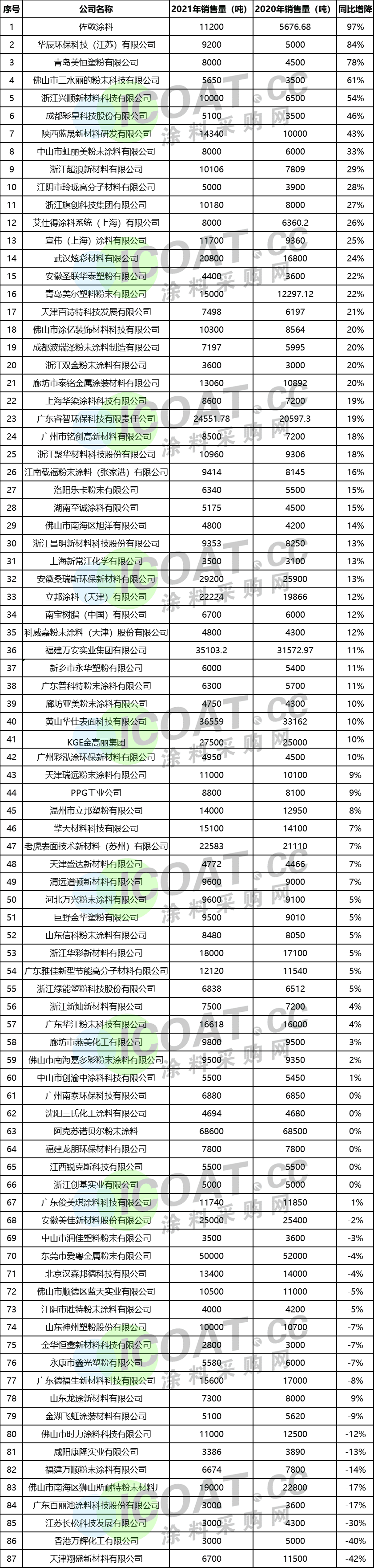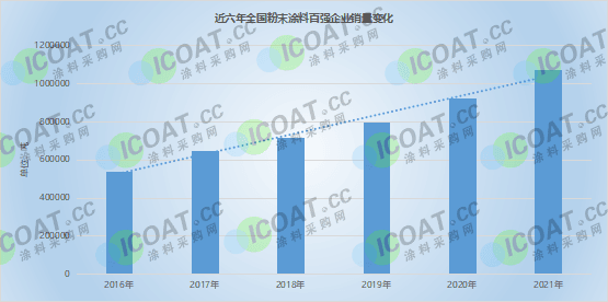 據(jù)涂料采購網(wǎng)不完全統(tǒng)計(jì),2021年全國粉末涂料銷售量100強(qiáng)企業(yè)的總銷量為1069082.98噸,同比增長16%。其中前三甲分別為阿克蘇諾貝爾粉末涂料、東莞市愛粵金屬粉末有限公司、黃山華佳表面科技有限公司。截至2021年,阿克蘇諾貝爾粉末涂料已連續(xù)五年蟬聯(lián)百強(qiáng)之首的寶座。