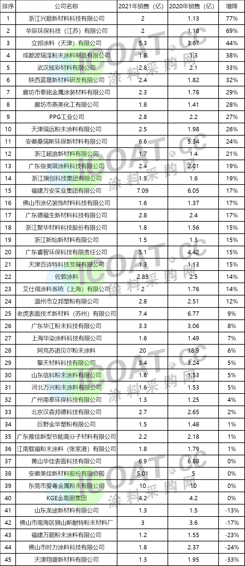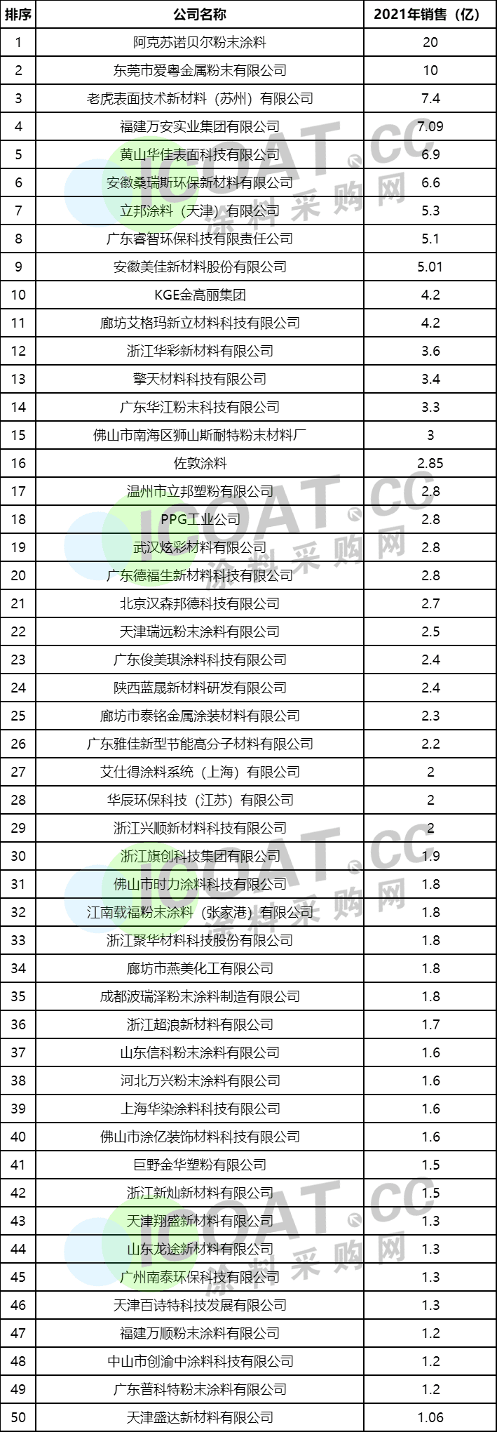 銷量是衡量一個(gè)企業(yè)市場占有率的參考值,而銷售額則是衡量一個(gè)企業(yè)市場銷售情況的重要指標(biāo)。據(jù)涂料采購網(wǎng)不完全統(tǒng)計(jì),2021年銷量50強(qiáng)粉末涂料企業(yè)總銷售額為160.76億元,同比增長17%。其中阿克蘇諾貝爾粉末涂料2021年的總銷售額為20億,相當(dāng)于2個(gè)東莞愛粵金屬粉末有限公司的銷售額,更相當(dāng)于3個(gè)老虎表面科技新材料(蘇州)有限公司,穩(wěn)坐頭把交椅。