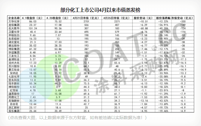 股市是經濟的晴雨表,股價也是上市公司業績的晴雨表,此前涂料采購網曾統計了年初至3月末的涂料產業鏈上市公司的情況,可謂是“綠意盎然”,腰斬一片,如今二季度還不到1/3,但是幾十家涂料、化工上市公司的市值已經蒸發了數百億,這也將目前整條化工產業鏈上企業的窘態彰顯的淋漓盡致。