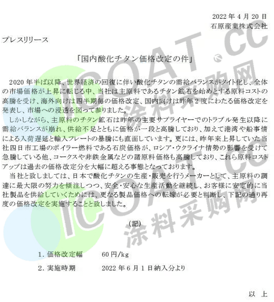 日本石原:由于鈦礦和煤炭等原材料價(jià)格持續(xù)上漲,自6月1日起,鈦白粉價(jià)格上調(diào)60日元/公斤(約500美元/噸)。