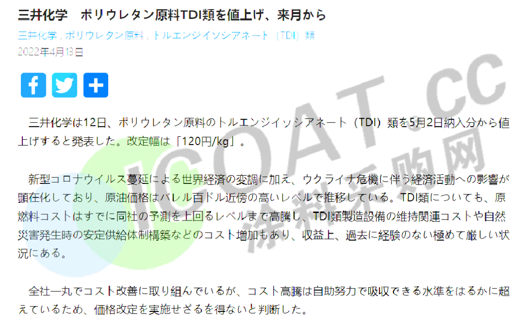 三井化學(xué):5月2日起上調(diào)聚氨酯原料甲苯二異氰酸酯 (TDI) 的價(jià)格,調(diào)漲120日元/kg(約合6060元/噸)。