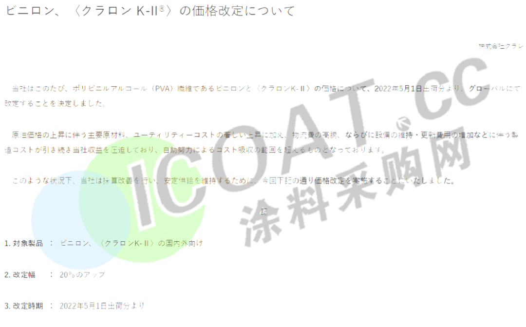 可樂(lè)麗:5月1日起,將對(duì)聚乙烯醇( PVA )纖維維尼綸和〈克拉倫K-Ⅱ〉的價(jià)格進(jìn)行全球范圍內(nèi)的上調(diào),漲幅高達(dá)20%。