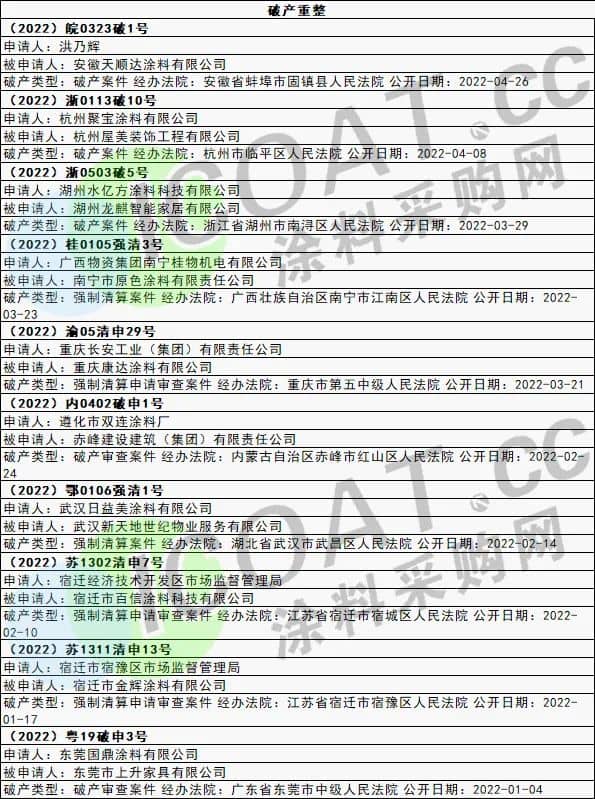 部分涂料企業破產重整名單