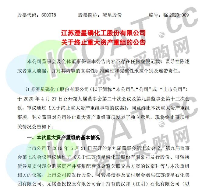 澄星股份擬發行股份、可轉換債券及支付現金購買江蘇澄星石化、無錫金投控股合計持有的漢邦石化100%股權并募集配套資金。由于受新型冠狀病毒肺炎疫情等影響,澄星集團及其關聯方對漢邦石化的非經營性資金占用清理工作進度延緩,無法徹底完成清理工作。公司與重組相關方審慎研究,決定終止本次重大資產重組事項。
