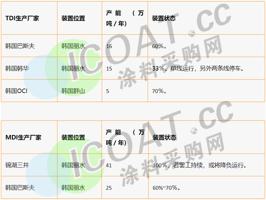 這場罷工直接導致韓國韓華位于麗水的TDI裝置降負33%運行,同時巴斯夫位于麗水的TDI和MDI裝置降負60%運行。