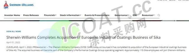 4月1日,宣偉宣布已完成對西卡歐洲工業涂料業務的收購,收購的業務將成為公司高性能涂料集團運營部門的一部分。