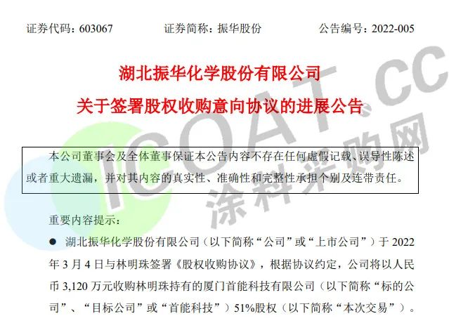 3月7日,湖北振華化學股份有限公司公告稱,公司與林明珠簽署《股權收購協議》,將以3120萬元收購林明珠持有的首能科技51%股權。