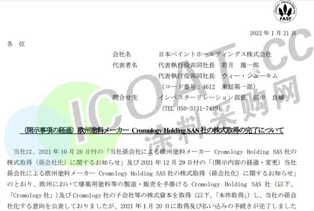 1月18日,科思創表示,通過約4至6百萬歐元(約合人民幣4300萬元)范圍內的收購價格,成功購買了JSR株式會社在合資公司日本精細涂料有限公司剩余30%的股份,從而使其成為科思創的全資子公司。