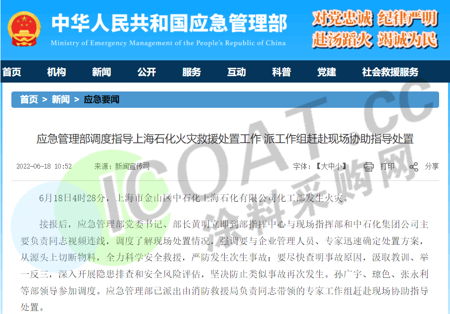 接報(bào)后,應(yīng)急管理部黨委書記、部長黃明立即到部指揮中心與現(xiàn)場指揮部和中石化集團(tuán)公司主要負(fù)責(zé)同志視頻連線,調(diào)度了解現(xiàn)場處置情況,強(qiáng)調(diào)要與企業(yè)管理人員、專家迅速確定處置方案,從源頭上切斷物料,全力科學(xué)安全救援,嚴(yán)防發(fā)生次生事故;應(yīng)急管理部已派出由消防救援局負(fù)責(zé)同志帶領(lǐng)的專家工作組趕赴現(xiàn)場協(xié)助指導(dǎo)處置。