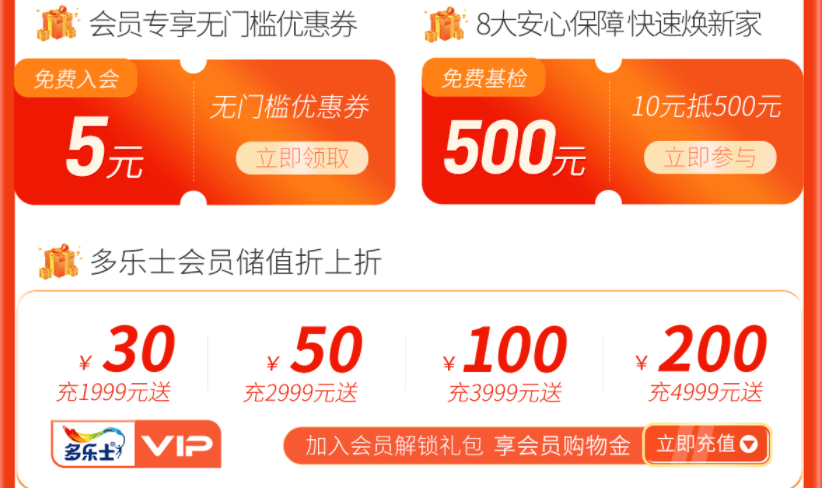 推出買兒童漆滿3999元或全店實付5999元送環球影城門票/迪士尼門票、實付滿2599元送100元京東E卡、實付滿4999元送300元京東E卡優惠活動(限量)。預售前100名享免定金特權,原價599的抗甲醛凈味全效面漆5L秒殺價199元(限量)。此外還有會員專享5元無門檻優惠券,多樂士會員儲值折上折等活動。