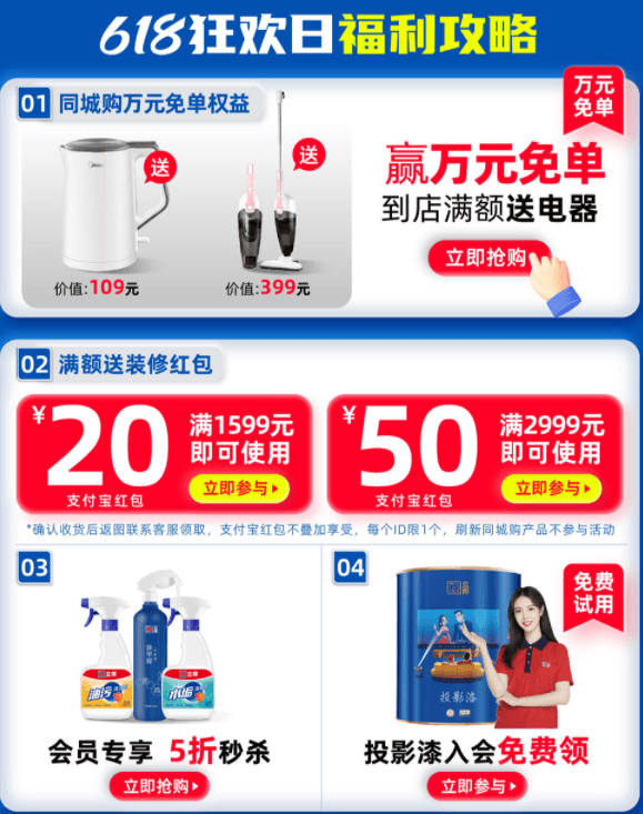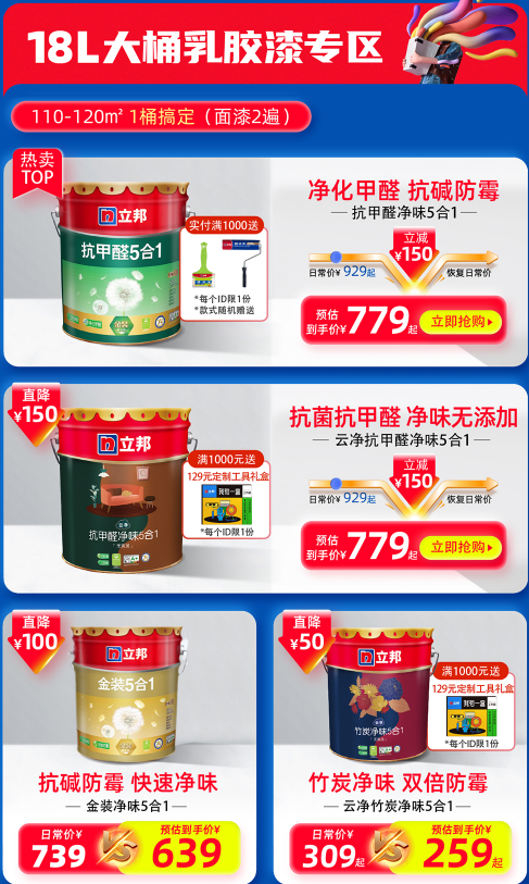 立邦涂料參與了淘寶618跨店滿減活動,每滿300元減50元(上不封頂),并推出了“618狂歡日福利”,到店滿額贏萬元免單,滿額送裝修紅包,會員5折秒殺,以及玩轉盤贏499禮盒等活動。除此之外,還實打實的對部分商品進行了立減50-150元的優惠,