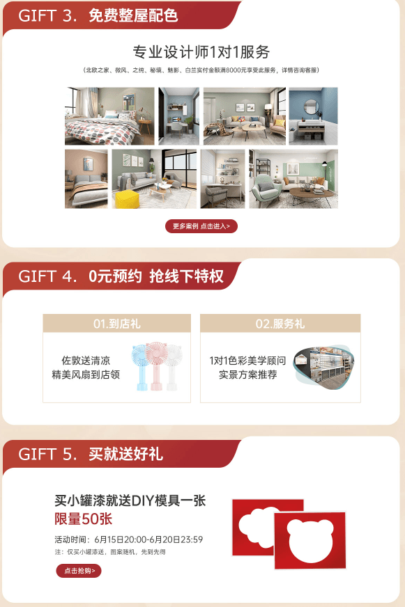 推出618優惠指南,可領會員30元無門檻優惠券,平臺199-20跨店優惠券,399-40跨店優惠券,及799-80跨店優惠券,滿3999元領200元E卡(限量)。可免費選色、免費試色、免費調色,部分產品立省1050元。