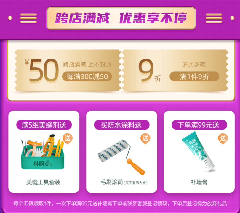 跨店滿減,滿300-50(不封頂),滿1件9折,多買多減。購買美縫劑、防水涂料等贈送美縫工具、毛刷滾筒等。