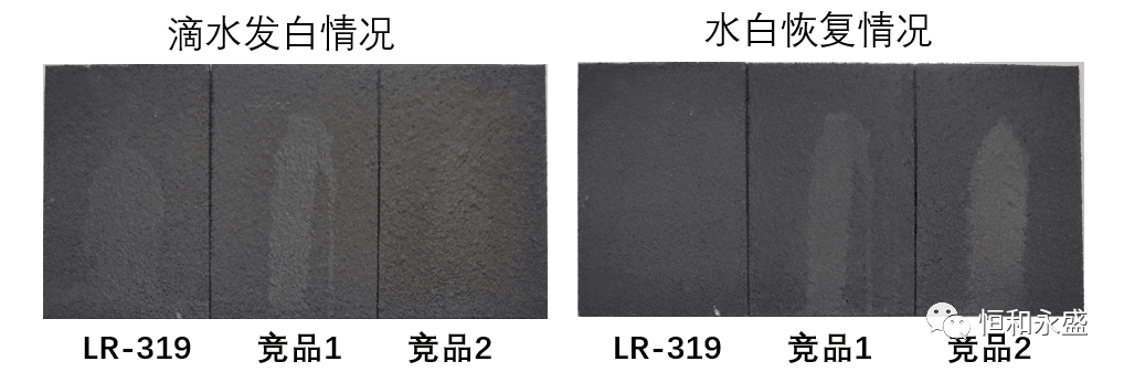 測試小結:由實驗測試結果可以看出,滴水后LR-319發白程度比競品輕,水白恢復性能也優于競品。