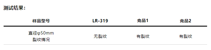 測試小結:LR-319直徑φ50mm無裂紋,競品均有裂紋,故LR-319的柔韌性比競品好。