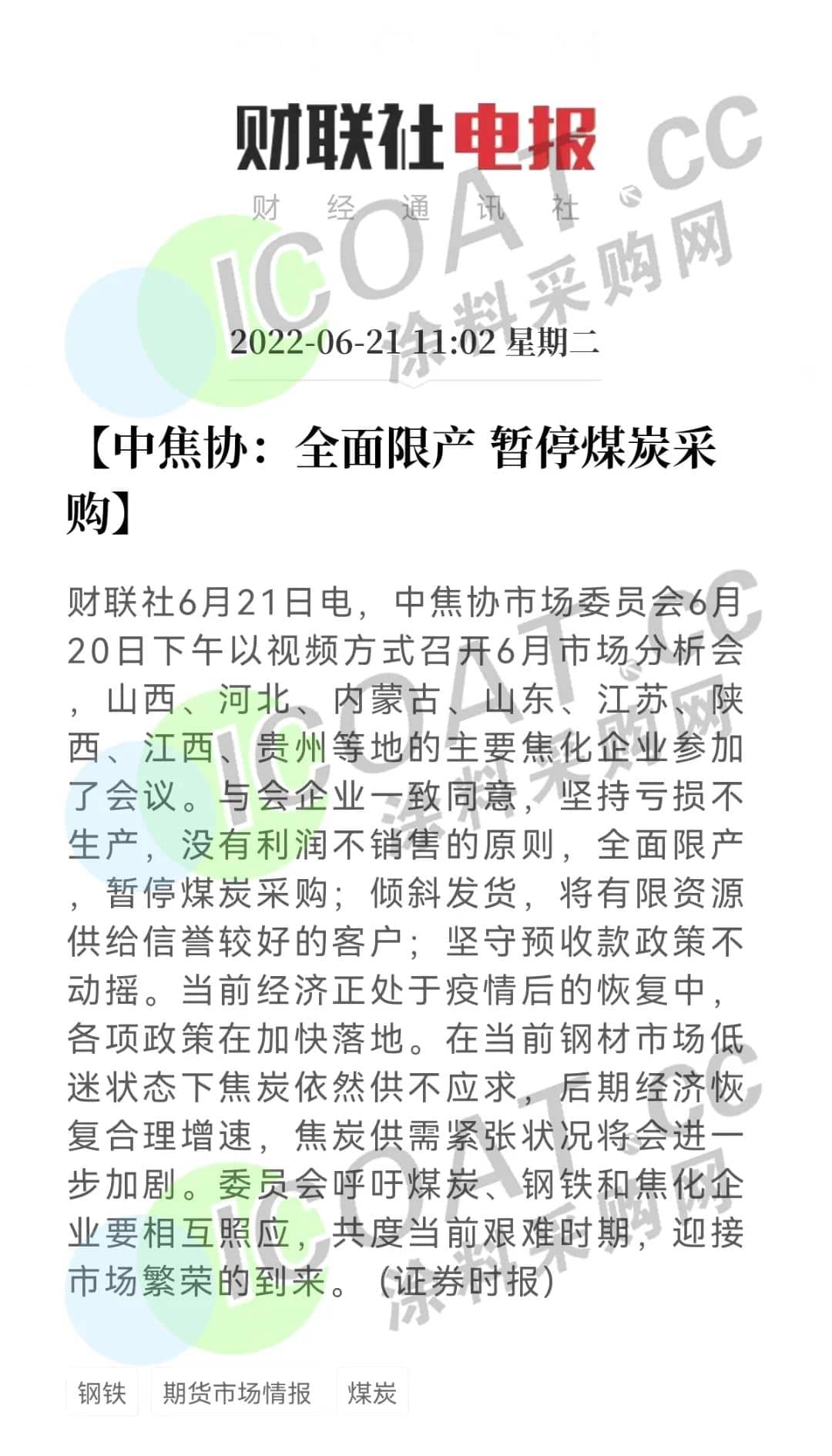 近日,中焦協市場委員會以視頻方式召開6月市場分析會,山西、河北、內蒙古、山東、江蘇、陜西、江西、貴州等地的主要焦化企業參加了會議。與會企業一致同意,堅持虧損不生產,沒有利潤不銷售的原則,全面限產,暫停采購。