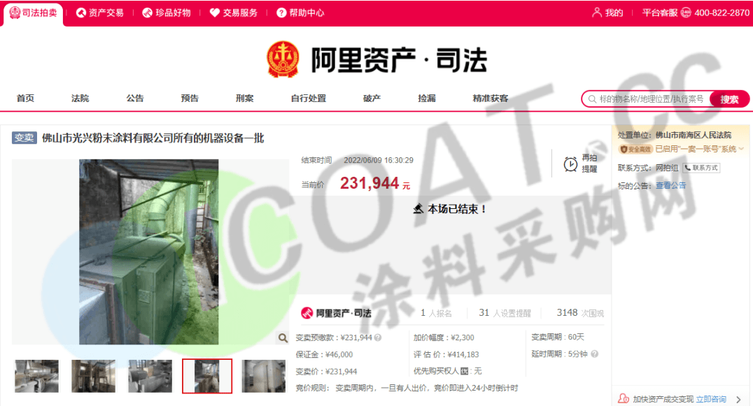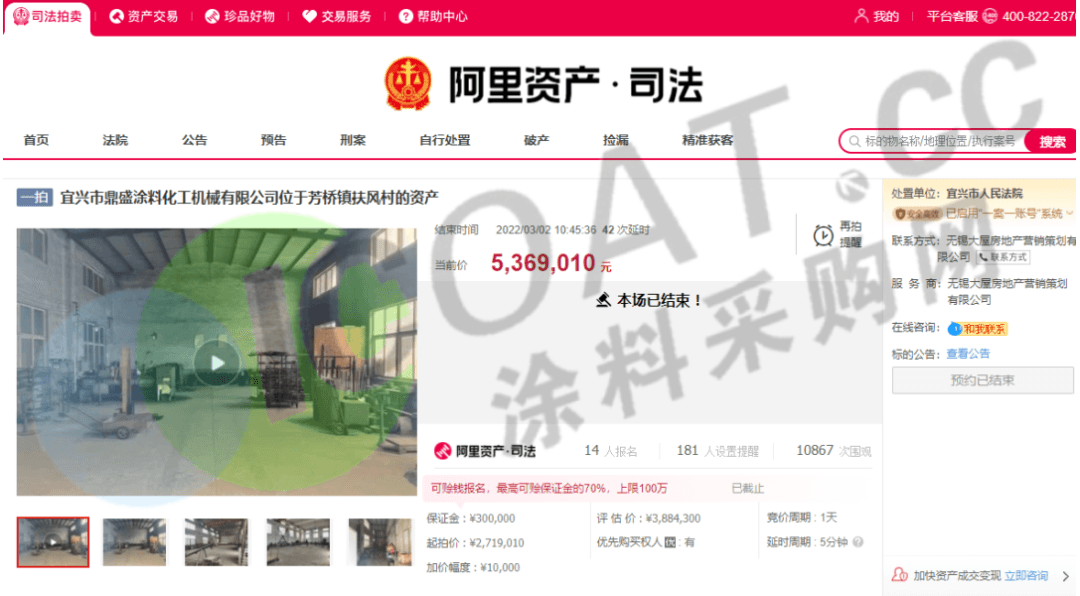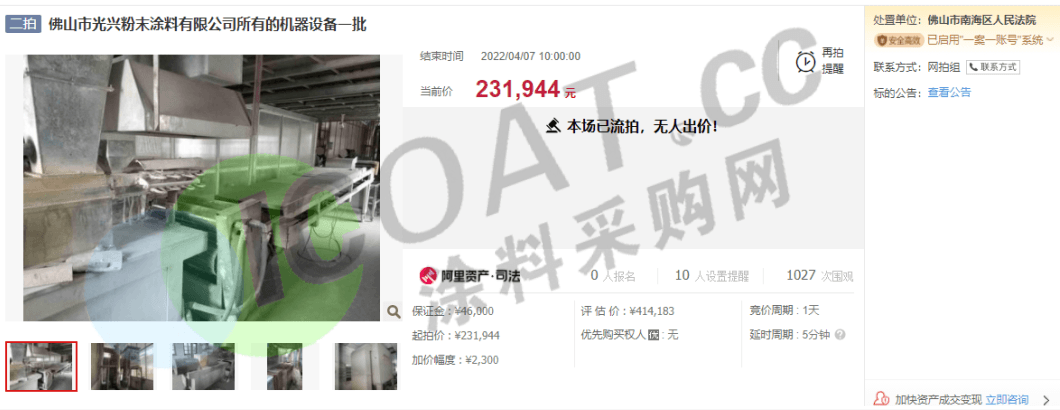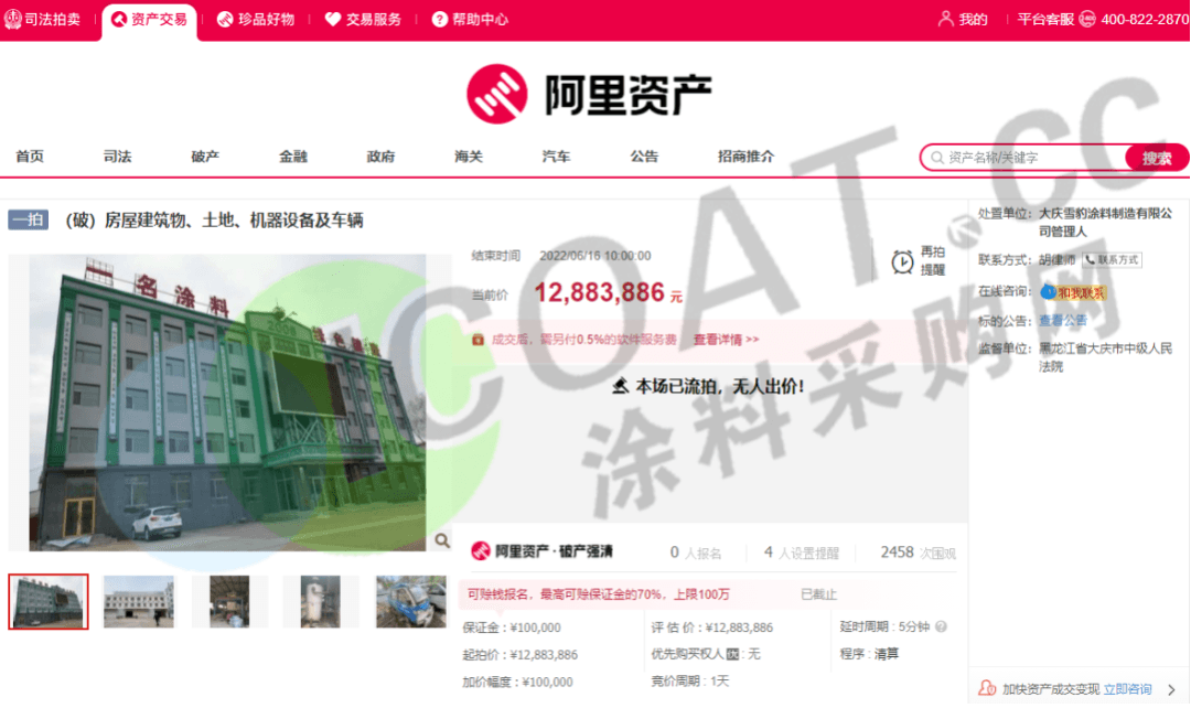 遺憾的是,盡管有2458次圍觀和4人設(shè)置提醒,本場拍賣卻因無人出價而流拍。而據(jù)涂料采購網(wǎng)了解,今年以來,多家涂料企業(yè)走上了司法拍賣之路,設(shè)備、廠房、股權(quán)、資產(chǎn)等都慘遭拍賣。