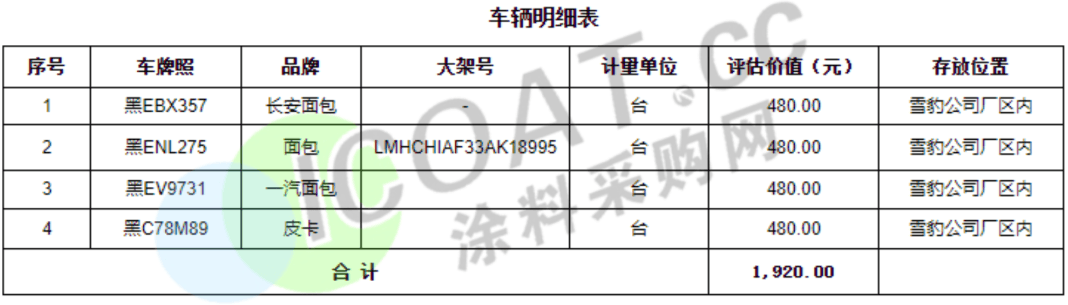 4.車輛:車輛共計4臺,評估價值為1920.00元。