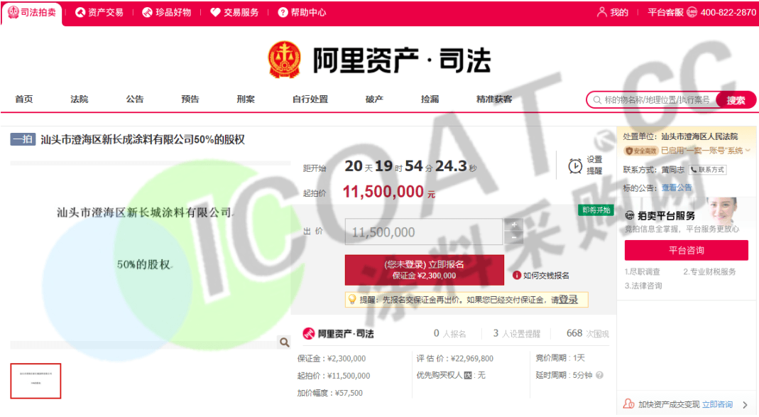 拍賣標的:被執(zhí)行人曾慶賞享有權(quán)益的汕頭市澄海區(qū)新長成涂料有限公司50%的股權(quán)。本股權(quán)不拆分拍賣。起拍價:1150萬元,保證金:230萬元,增價幅度:5.75萬元(或其整數(shù)倍)。