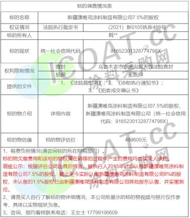 拍賣標的:新疆澳唯克涂料制造有限公司7.5%的股權(quán),新疆澳唯克涂料制造有限公司(統(tǒng)一社會信用代碼:91652301328774798X)。