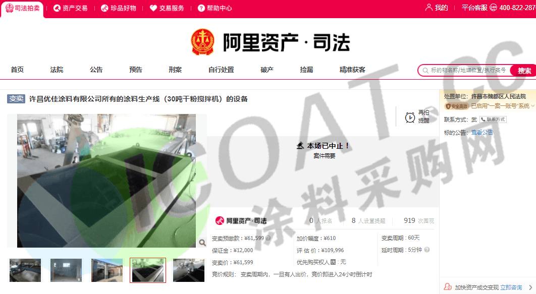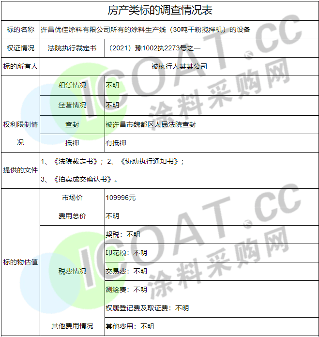 拍賣標的:許昌優(yōu)佳涂料有限公司所有的涂料生產(chǎn)線(30噸干粉攪拌機)的設(shè)備。機器設(shè)備主要有:涂料生產(chǎn)線一套,規(guī)格30噸,含配套的螺旋輸送機及鐵架。