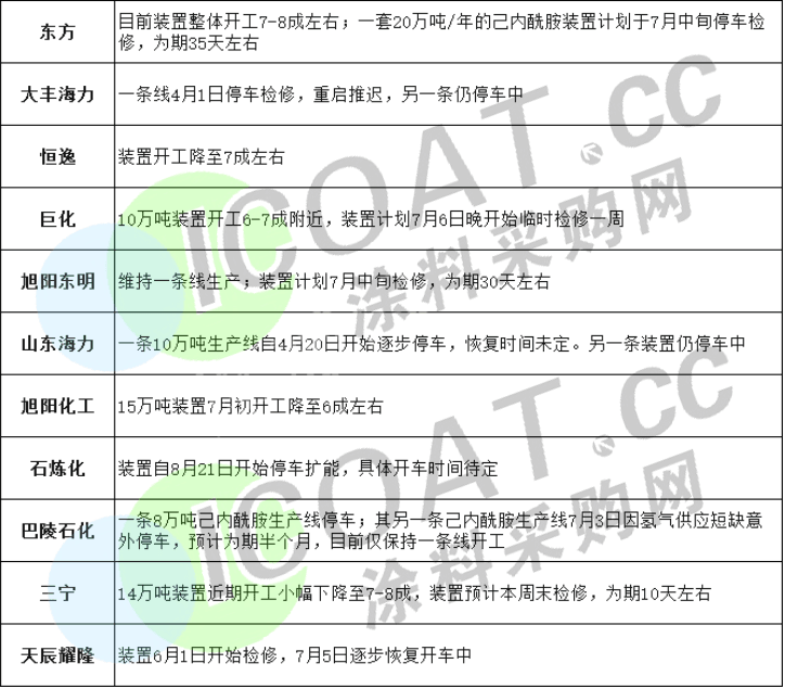 己內酰胺行業,因企業生產虧損加劇,國內廠家裝置檢修或減產逐步增多,市場供應收緊,行業整體開工降至7成左右。目前陽煤不報價,負荷七成;神馬負荷七成;三寧蘭花,負荷八成,蘭花庫存稍多,三寧不出現貨,主供長協,近期計劃檢修;東明中旬停車;慶華計劃中旬停車;巴陵石化近期停車;巨化在檢修中;天辰耀隆負荷提升至六成;南京東方負荷8成。