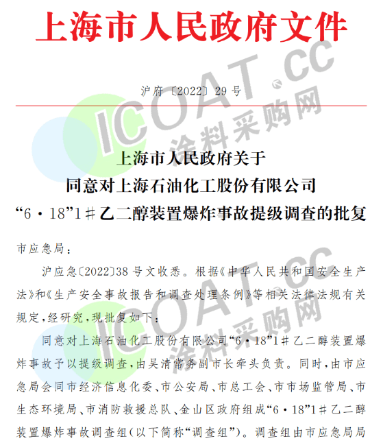 近日,上海市人民政府發布關于同意對上海石油化工股份有限公司“6·18”1#乙二醇裝置爆炸事故提級調查的批復。批復稱,同意對上海石化“6·18”1#乙二醇裝置爆炸事故予以提級調查,由副市長牽頭負責。