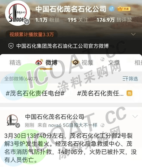 3月30日,茂名石化化工分部2號裂解3號爐發生著火,沒有人員傷亡。
