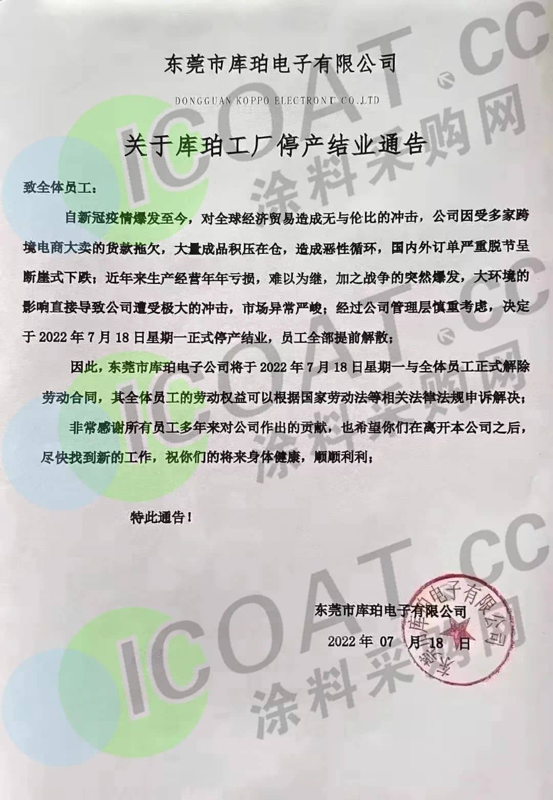 近日,知名制造業工廠——東莞庫珀電子發布《關于庫珀工廠停產結業通告》,稱因受多家跨境電商大賣的貨款拖欠,大量成品積壓在倉。國內外訂單嚴重脫節呈斷崖式下跌。疫情疊加俄烏戰爭危機,生產經營年年虧損。經慎重考慮,確定于7月18日正式停產結業,員工全部提前解散。
