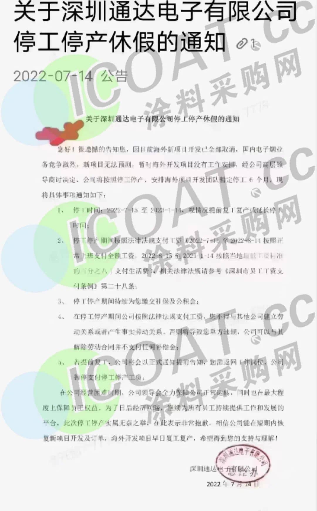 深圳通達電子:因目前海外新項目開發已全部取消,國內業務競爭激烈,新項目無法預測,暫時海外開發項目沒有工作安排,經商討決定,企業將停工停產,安排海外項目開發團隊暫定停工6個月。停工時間為2022年7月15日至2023年1月14日,視情況提前復工復產或延長停工時間。