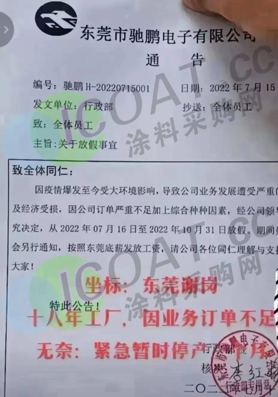 東莞市馳鵬電子:因訂單嚴重不足加上綜合因素,經研究決定,從2022年7月16日至10月31日放假,按照東莞底薪發放工資。