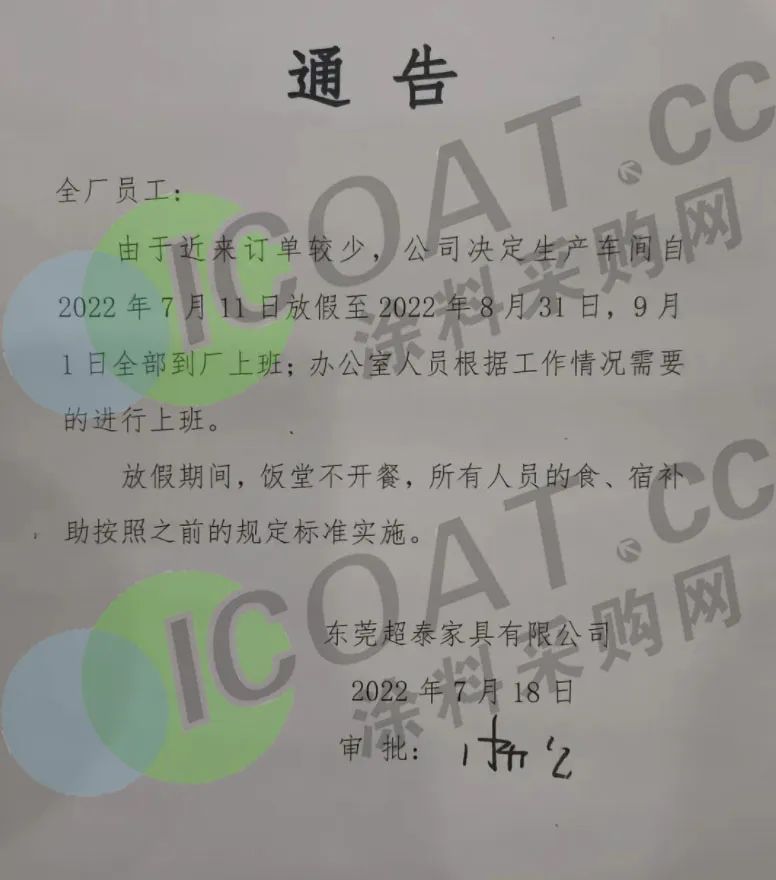 東莞超泰家具:由于近來訂單較少,企業決定生產車間自2022年7月11日放假至8月31日,放假期間飯堂不開餐。