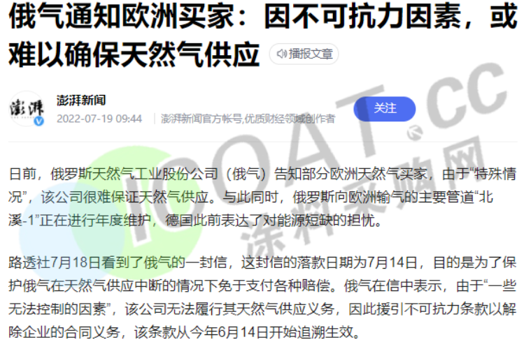 近日,俄羅斯天然氣工業股份公司告知多家歐洲客戶,由于“特殊”情況,其無法保證日后的天然氣供應。此消息傳出之際,俄羅斯通往歐洲的最主要的天然氣輸送管道——“北溪1號”剛開始進行為期十天的年度維護工作。