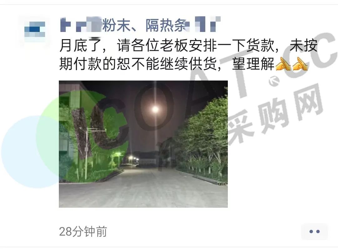 近日,某粉末涂料廠在社交平臺(tái)宣布,月底請(qǐng)各位老板安排一下貨款,未按期付款的恕不能繼續(xù)供貨。