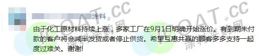 某涂料企業(yè)表示,由于化工原材料持續(xù)上漲,多家工廠在9月1日明確開(kāi)始漲價(jià),有到期未付款的客戶將會(huì)減半發(fā)貨或暫停發(fā)貨。