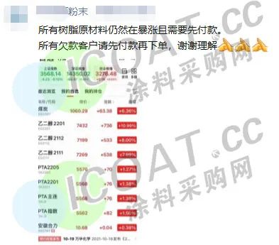 某涂料企業(yè)表示,所有樹(shù)脂原材料仍在暴漲,需要先付款,所以請(qǐng)下游欠款客戶先付款再下單。