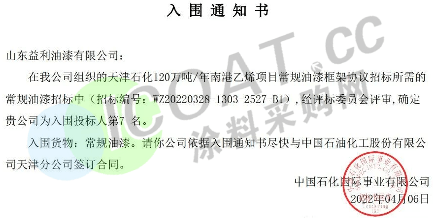 長江涂料以優異的成績中標中石化2022年度涂料采購招標常用漆、水性工業漆、建筑涂料三個項目包。