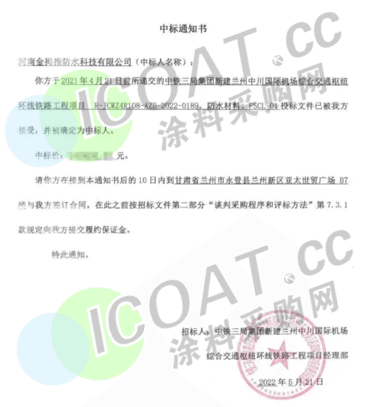 中交集團供應鏈采購管理系統發布了中交四公局第三工程有限公司2022年度防水材料(含施工)框架協議供應商入圍招標采購評標結果公示,北京東方雨虹防水工程有限公司、科順防水科技股份有限公司、北新禹王防水工程有限公司、北京金盾建材有限公司、株洲飛鹿高新材料技術股份有限公司、禹王(北京)科技工程有限公司、河南恒騰防水防腐有限公司成為該項目擬中標單位。