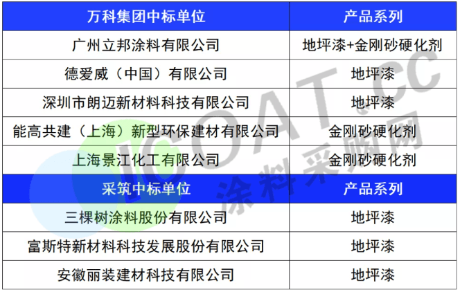 采筑官方微信公眾平臺發布了萬科、采筑地坪材料集采中標公告。其中,廣州立邦涂料有限公司、德愛威(中國)有限公司成為萬科集團地坪集采中標單位;三棵樹涂料股份有限公司成為采筑中標單位。