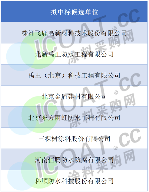 中國交建物資采購管理平臺和中國電建設備物資集中采購管理平臺發布了多個項目防水材料采購中標公告。其中,北京東方雨虹防水技術股份有限公司、三棵樹涂料股份有限公司、雨中情防水技術集團股份有限公司、成都賽特防水材料有限責任公司、中建友(唐山)科技有限公司、遠大洪雨(唐山)防水材料有限公司和大禹九鼎新材料科技有限公司成為多個防水材料采購項目中標候選人。