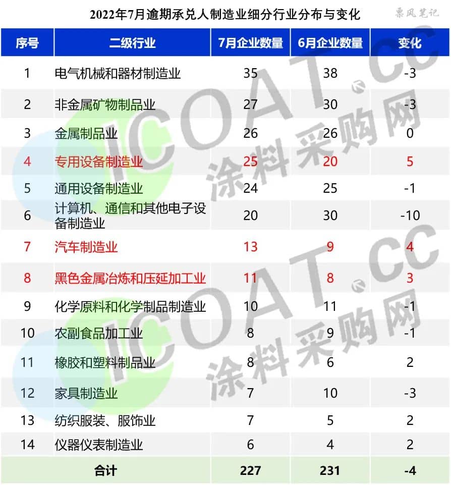 除了房地產之外,制造業逾期承兌數量達到257家,占總逾期數量的8.26%,也是占比較大的產業。再進一步細分,汽車制造業、通用設備制造業、化學原料制造業數量均比較驚人,7月逾期數量分別為13、24、10,占比分別為0.42%、0.77%、0.32%。
