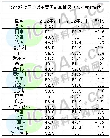 分區(qū)域看,7月份,亞洲、歐洲、美洲和非洲制造業(yè)采購經(jīng)理指數(shù)較上月均有不同程度下降,且均創(chuàng)出階段性低點(diǎn)。綜合指數(shù)變化,全球制造業(yè)采購經(jīng)理指數(shù)連續(xù)2個(gè)月環(huán)比下降,顯示全球制造業(yè)增速持續(xù)放緩,全球經(jīng)濟(jì)復(fù)蘇動(dòng)力進(jìn)一步趨弱,下行壓力加大。