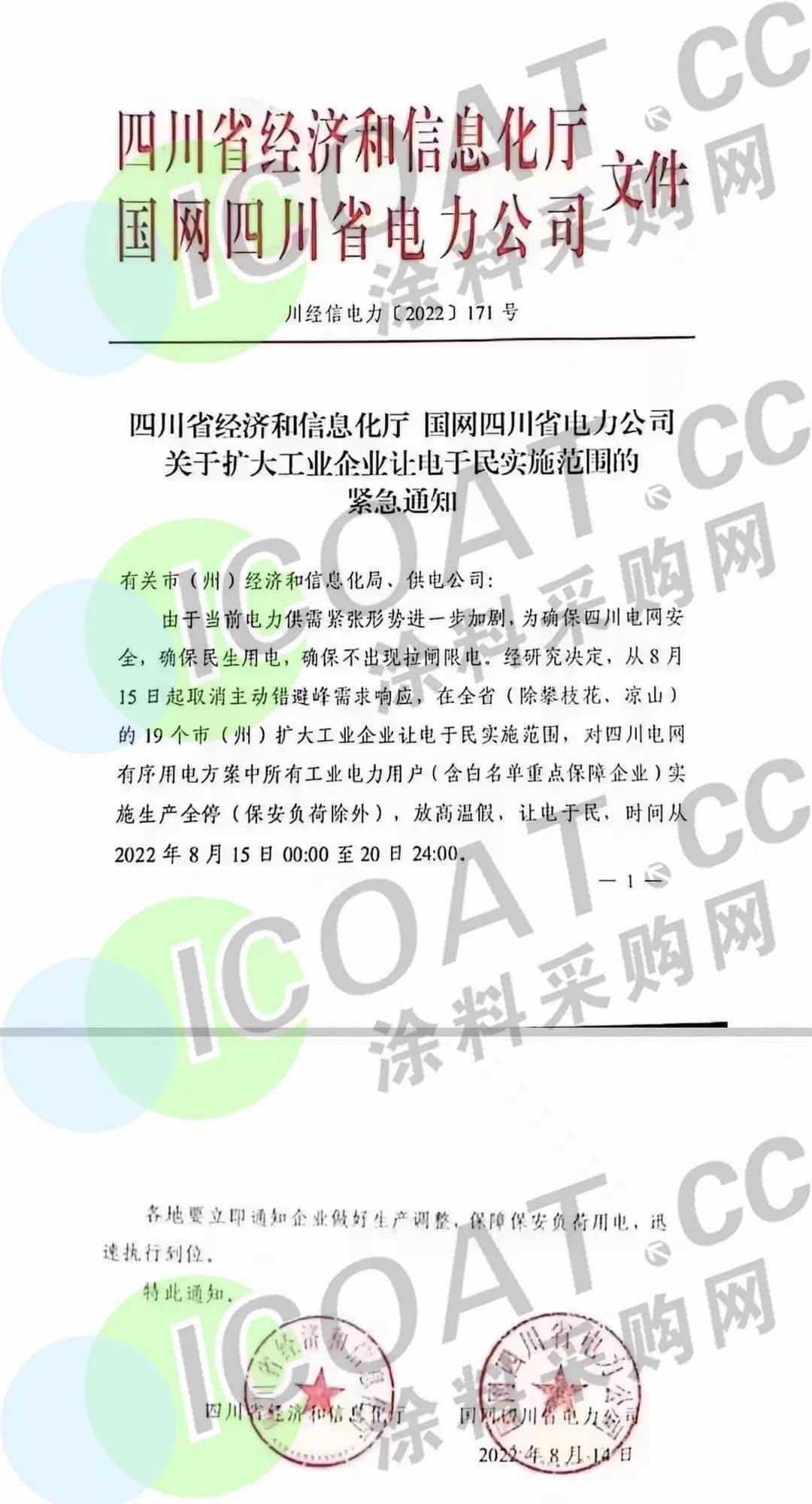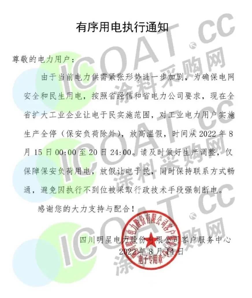 四川明星電力發(fā)布《有序用電執(zhí)行通知》,按照省經(jīng)信和省電力公司要求,現(xiàn)在全省擴(kuò)大工業(yè)企業(yè)讓電于民實(shí)施范圍,對(duì)工業(yè)電力用戶實(shí)施生產(chǎn)全停(保安負(fù)荷除外),放高溫假,時(shí)間從2022年8月15日00:00至20日24:00。
