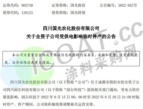 農(nóng)藥生產(chǎn)企業(yè)國(guó)光股份:受電力供應(yīng)緊張影響,其全資子公司潤(rùn)爾科技將于8月15日零時(shí)至8月20日24時(shí)臨時(shí)停產(chǎn)。