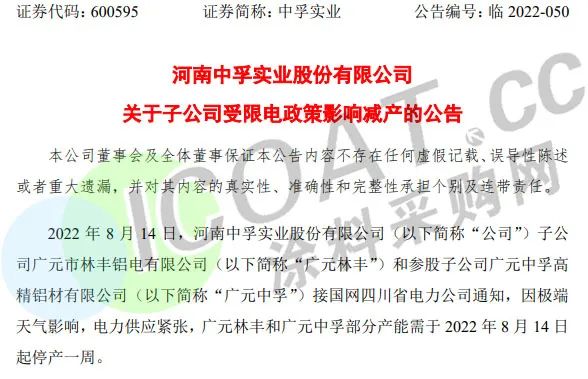 鋁業(yè)龍頭中孚實(shí)業(yè):子公司廣元林豐和參股子公司廣元中孚部分產(chǎn)能需于8月14日起停產(chǎn)一周。預(yù)計(jì)將影響上述兩家子公司電解鋁產(chǎn)量合計(jì)減少1.29萬(wàn)噸,對(duì)應(yīng)減少凈利潤(rùn)約0.78億元。