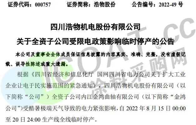 整車銷售龍頭浩物股份:全資子公司內(nèi)江金鴻曲軸有限公司受酷暑極端天氣導(dǎo)致的電力緊張影響,自8月15日00:00至20日24:00生產(chǎn)線全線臨時(shí)停產(chǎn)。